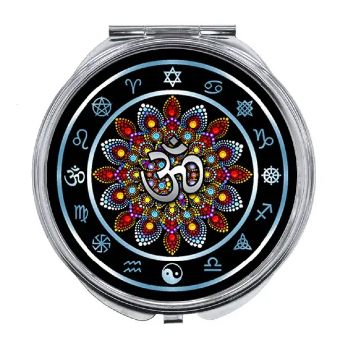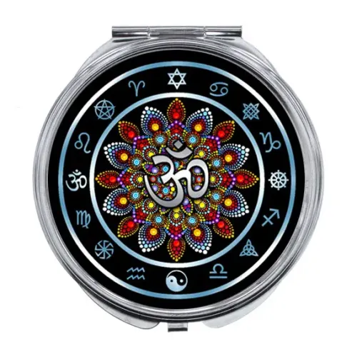 Складное зеркало с изображением мандалы Ом. Материал — металл и стекло.