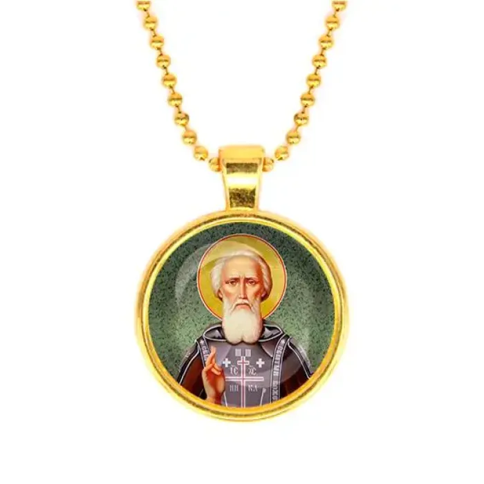 Кулон с изображением Сергея Радонежского — это не только стильное украшение, но и символ духовности и веры. Он выполнен из бижутерного сплава с покрытием под золото и дополнен стеклянной линзой, защищающей изображение. Основные особенности: