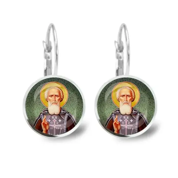 Эти изысканные серьги с изображениями диаметром 18 мм под выпуклыми стеклянными линзами станут прекрасным дополнением к любому образу. Каждая пара выполнена из бижутерного сплава с покрытием под серебро, что придаёт им элегантный вид и долговечность. Особый тип замка — левербэк — сочетает в себе удобство английской и французской застёжки, обеспечивая надежную фиксацию. Серьги не только украшение, но и символ духовности, так как они посвящены Сергию Радонежскому, известному святому в русской культуре. Эти аксессуары идеально подходят для повседневной носки или особых случаев.