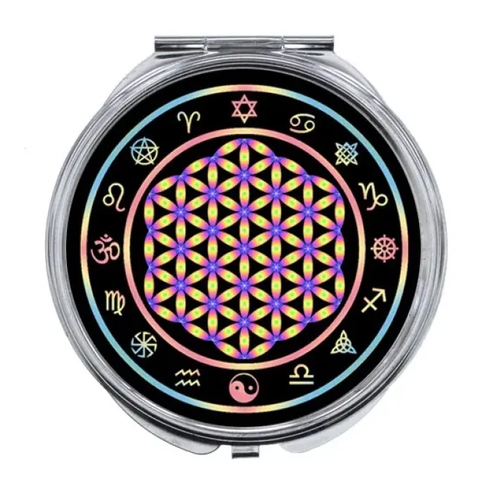 Складное зеркало «Цветок жизни» — сувенирный аксессуар из металла и стекла с полноцветным изображением.