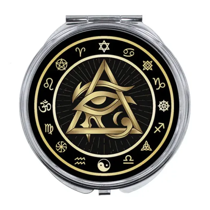 Складное зеркало с изображением Око Ра. Изготовлено из металла и стекла.