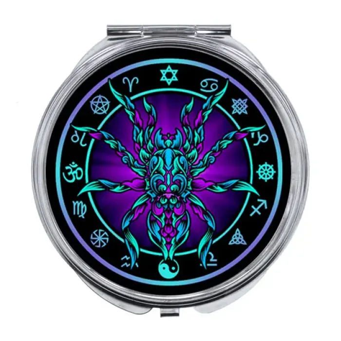 Складное зеркало с полноцветной печатью изображения паука на металлической основе.