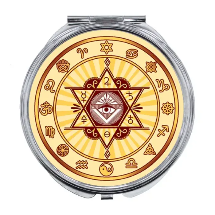 Складное зеркало с изображением Звезды Давида. Изготовлено из металла и стекла.