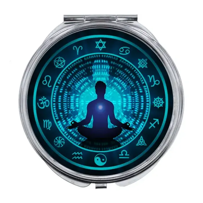 Складное зеркало для личного использования, изготовленное из металла и стекла, с полноцветным изображением.