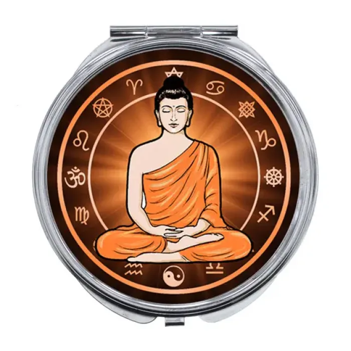 Складное зеркало с изображением Будды. Изготовлено из металла и стекла.