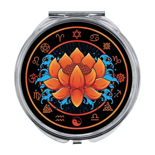 Складное зеркало с изображением лотоса. Изготовлено из металла и стекла.