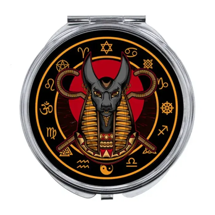 Складное зеркало с изображением Анубиса. Изготовлено из металла и стекла.