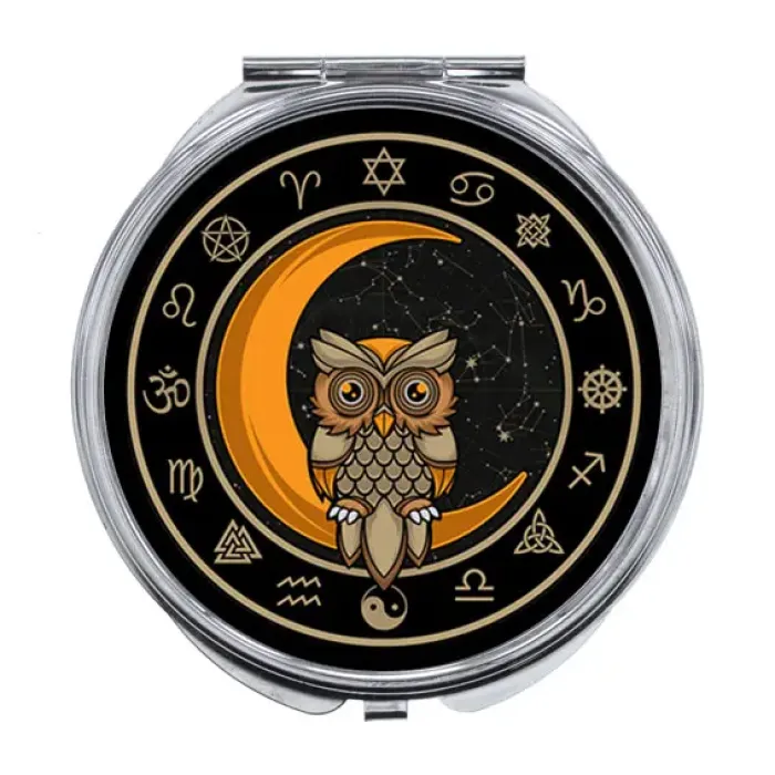 Складное зеркало с изображением совы на месяце для использования в качестве сувенира или интерьерного декора.