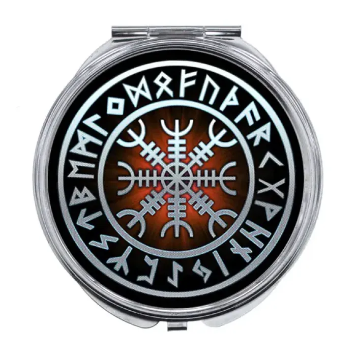 Складное зеркало с изображением Креста непобедимости. Изготовлено из металла и стекла.