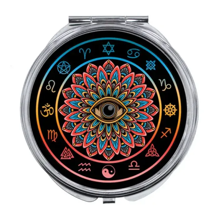 Складное зеркало с изображением мандалы. Материалы: металл и стекло.