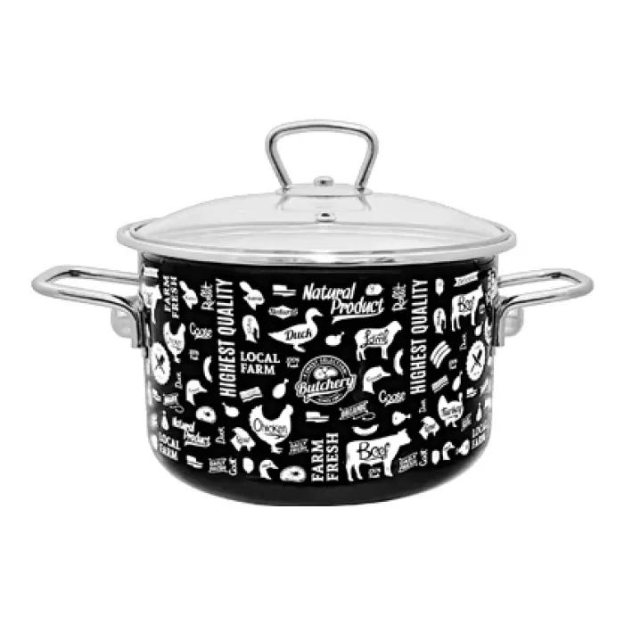 Кастрюля изготовлена из стали с эмалевым покрытием, которое защищает металл от коррозии и упрощает очистку. Цилиндрическая форма способствует равномерному распределению тепла по всей поверхности дна и стенок. Стеклянная крышка позволяет визуально контролировать процесс приготовления без потери тепла.