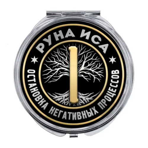 Складное зеркало с полноцветным изображением руны Иса. Изготовлено из металла и стекла.