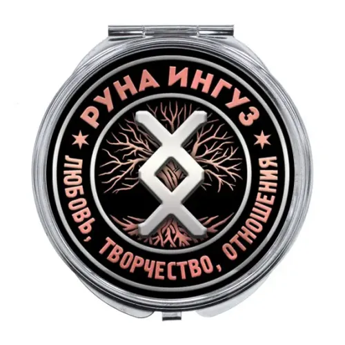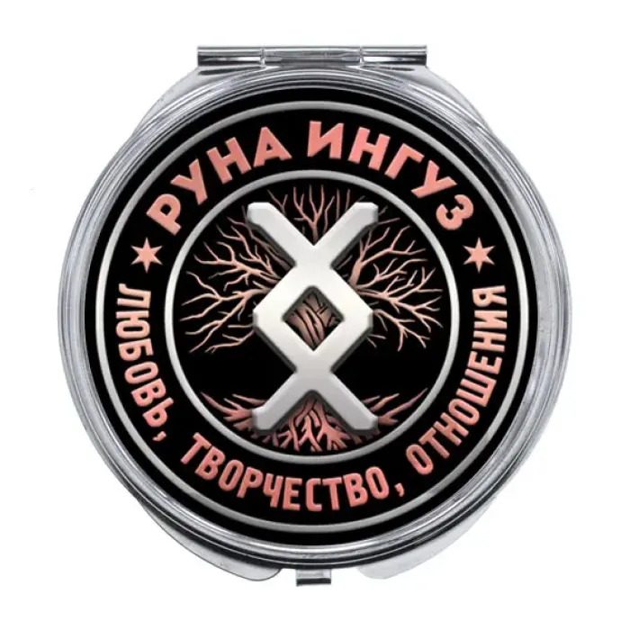 Складное зеркало с изображением руны Ингуз. Материалы: металл и стекло.