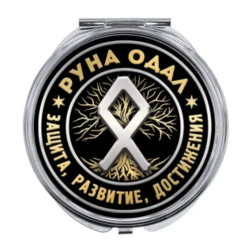 Складное зеркало с изображением руны Одал. Изготовлено из металла и стекла.