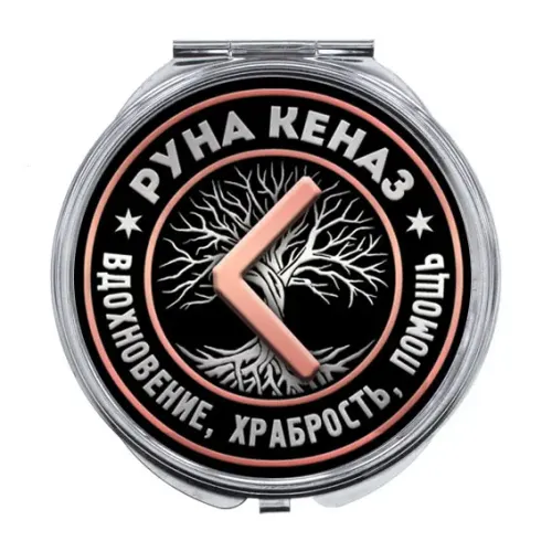 Складное зеркало с изображением руны Кеназ. Материал — металл и стекло.