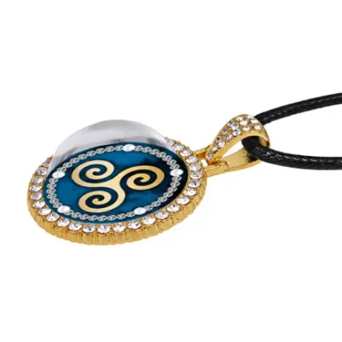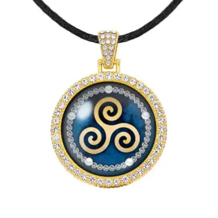 Амулет Трискель — это стильный кулон, выполненный из бижутерного сплава с покрытием под жёлтое золото. Этот уникальный аксессуар инкрустирован качественными австрийскими стразами, что придаёт ему особое очарование и блеск. Изображение находится под выпуклой стеклянной линзой толщиной 12 мм, обеспечивая защиту и яркость деталей.