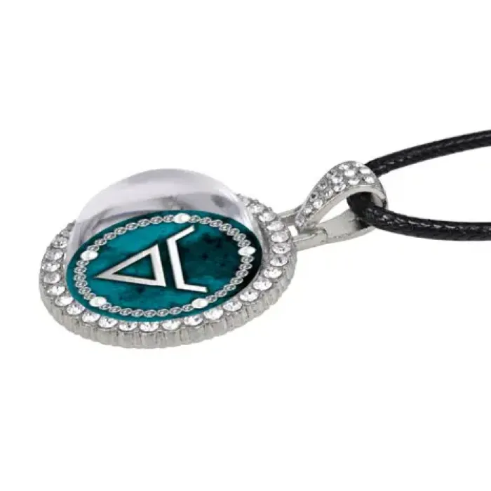 Сувенирный амулет-кулон из бижутерного сплава с покрытием под серебро и инкрустацией стразами.