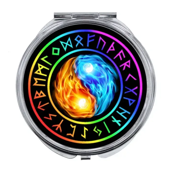 Складное зеркало с символом Инь-Ян. Изготовлено из металла и стекла.