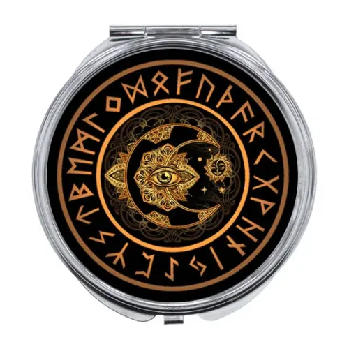 Складное зеркало с изображением Месяца и Солнца. Изготовлено из металла и стекла.