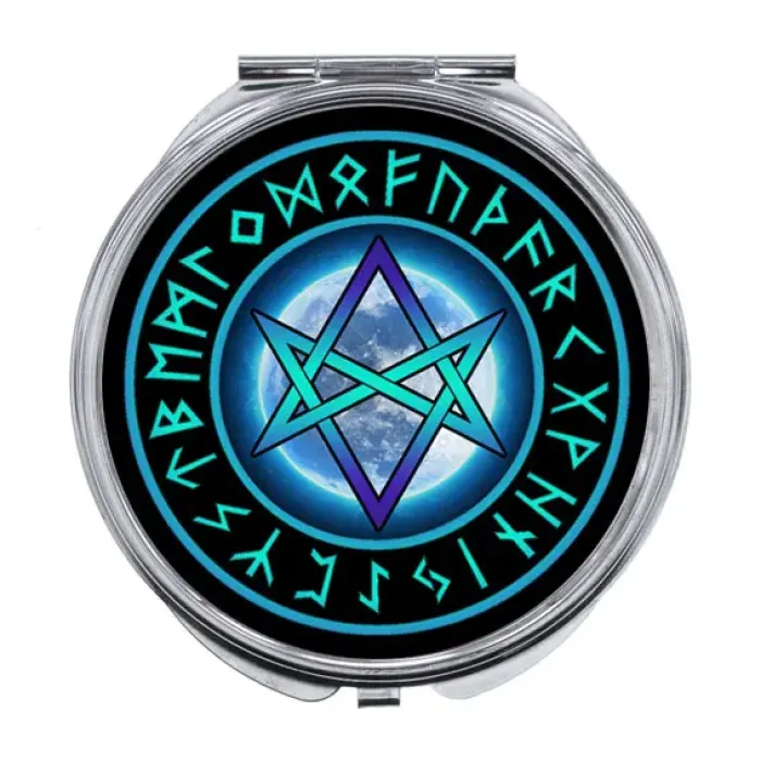 Складное зеркало с полноцветным изображением уникурсальной гексаграммы на металлической основе.