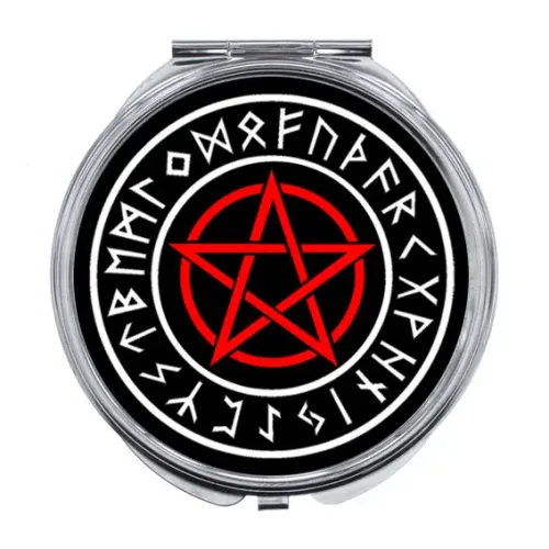 Складное зеркало с символикой пентаграммы. Материалы: металл и стекло.