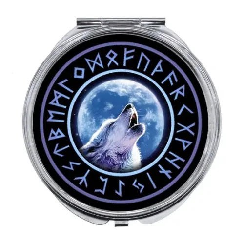 Складное зеркало с изображением волка. Изготовлено из металла и стекла с полноцветной печатью.