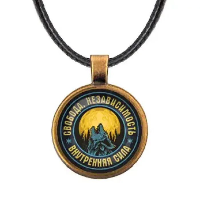 Кулон из бижутерного сплава с изображением волка на фоне луны под выпуклой стеклянной линзой.