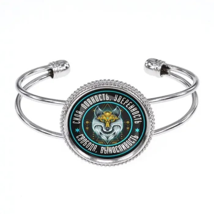 Браслет из бижутерного сплава с изображением волка под выпуклой стеклянной линзой.
