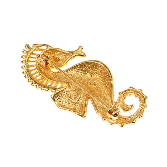 Брошь в форме морского конька из бижутерного сплава с золотым покрытием и стразами.