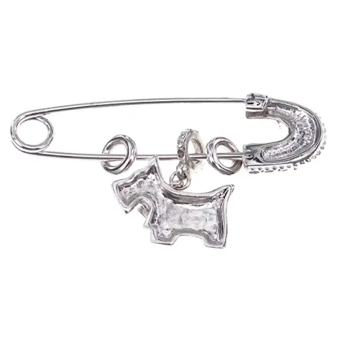 Брошь-булавка в форме собаки из бижутерного сплава с серебряным покрытием и стразами.