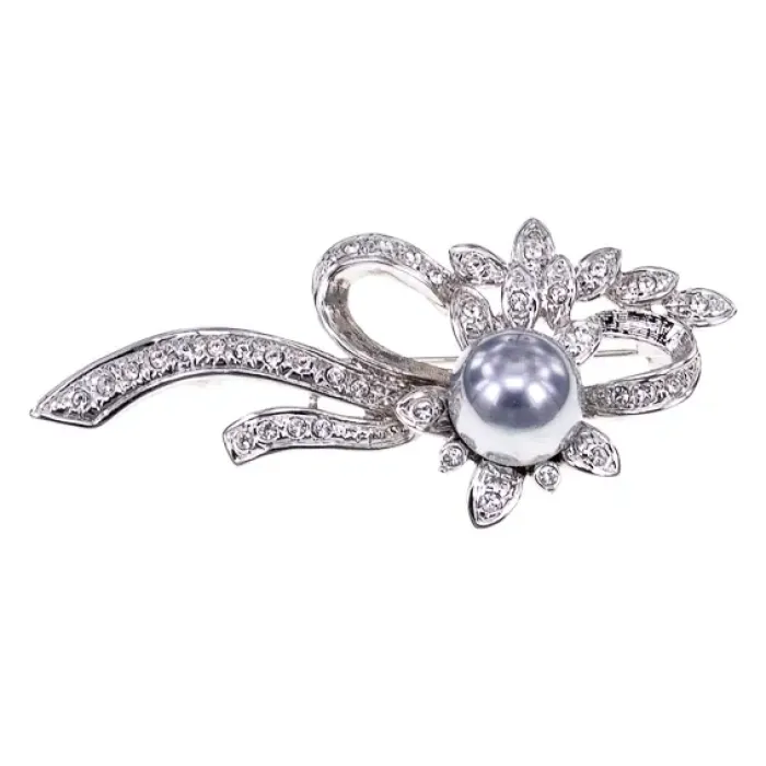 Материал и изготовление: Бижутерный сплав с покрытием, украшен вставками из страз и искусственного жемчуга.