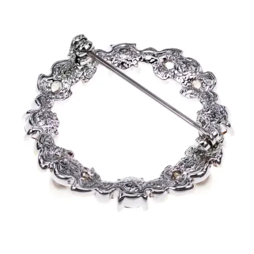Брошь в виде венка из бижутерного сплава с позолоченным покрытием, декорированная стразами и искусственным жемчугом.