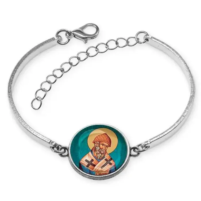 Браслет Спиридона Тримифунтского — это стильный аксессуар с глубоким культурным смыслом. Он выполнен из бижутерного сплава и украшен изображением диаметром 18 мм под выпуклой стеклянной линзой. Этот браслет не только привлекает внимание своим элегантным дизайном, но и символизирует веру и защиту.