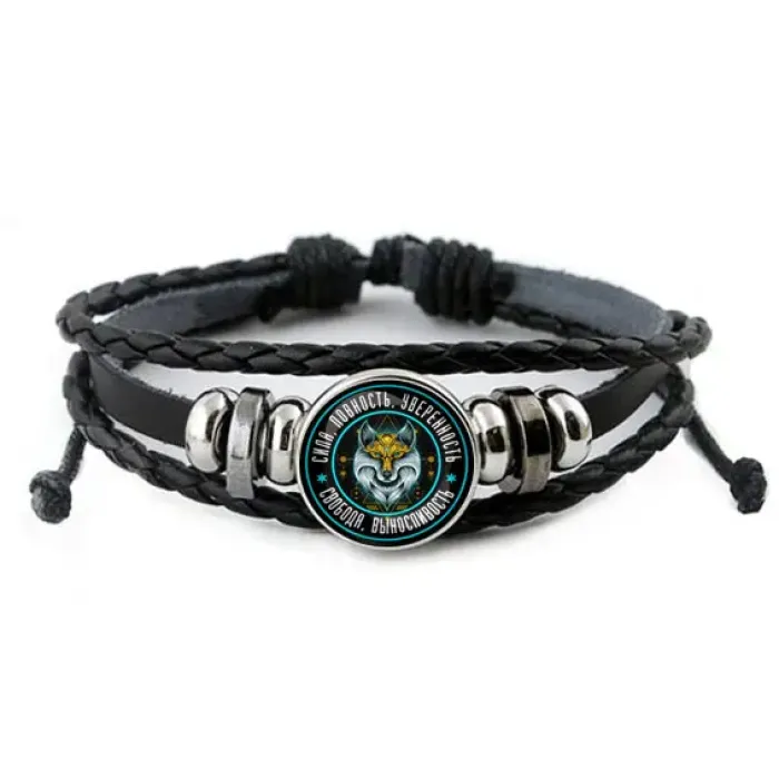 Кожаный браслет с декоративным элементом в виде волка. Изготовлен из синтетической кожи, металла и стекла.