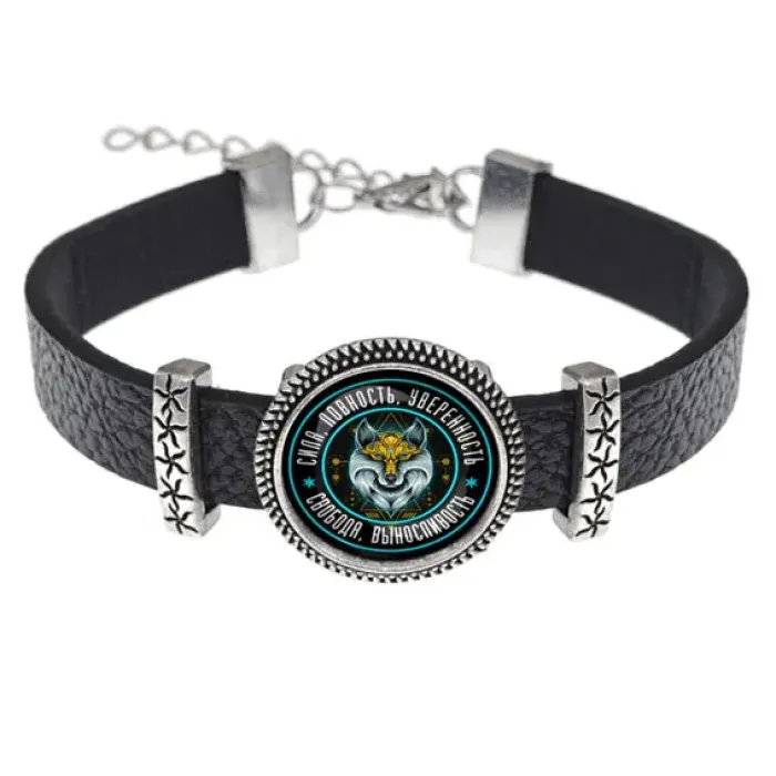 Кожаный браслет с декоративным элементом в виде волка под стеклянной линзой.