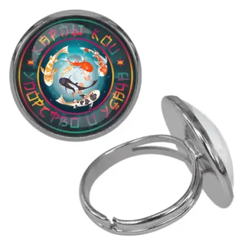 Безразмерное кольцо с изображением карпов кои. Изготовлено из бижутерного сплава с покрытием под серебро, защищено выпуклой стеклянной линзой.