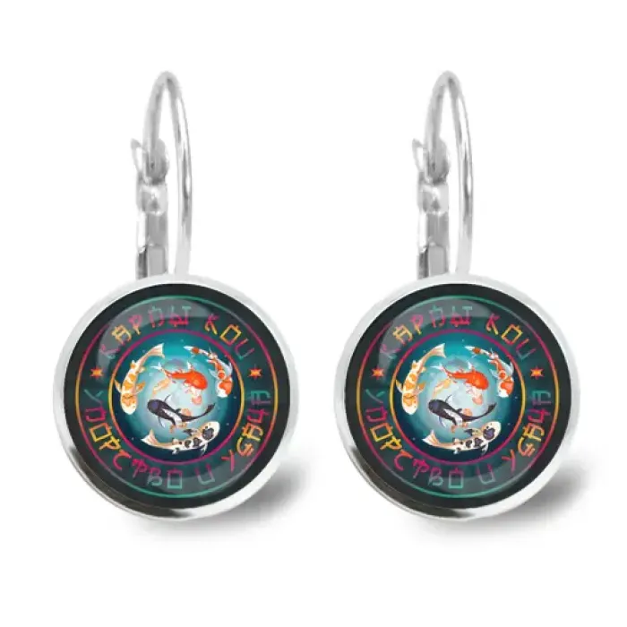 Серьги из бижутерного сплава с изображением карпов кои под выпуклыми стеклянными линзами.
