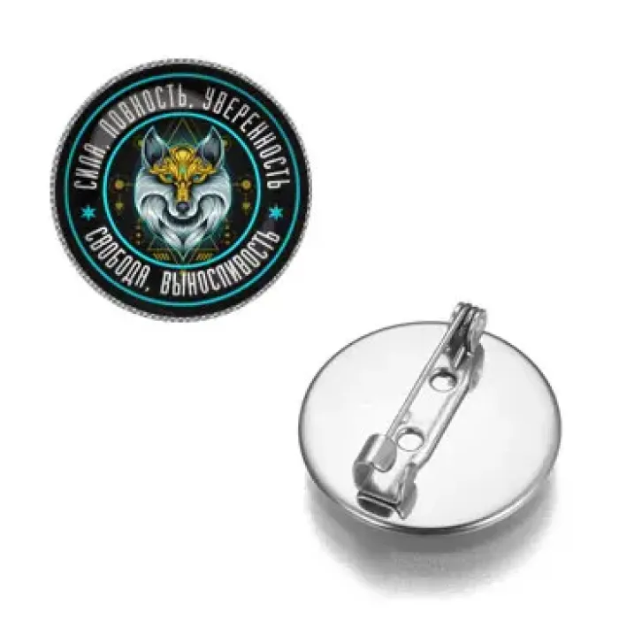Значок из бижутерного сплава с изображением волка под выпуклой стеклянной линзой.
