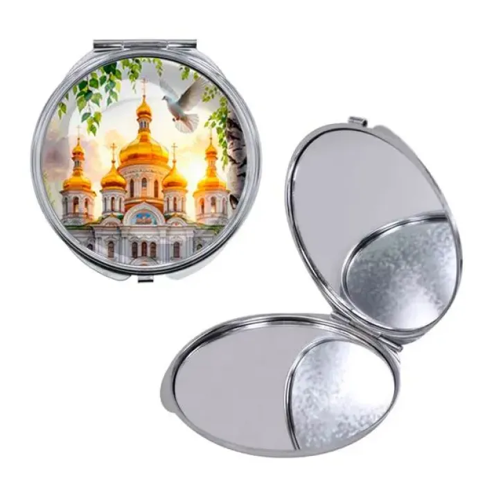 Круглое складное зеркало, цвет серебро, Храм и березы C1160016