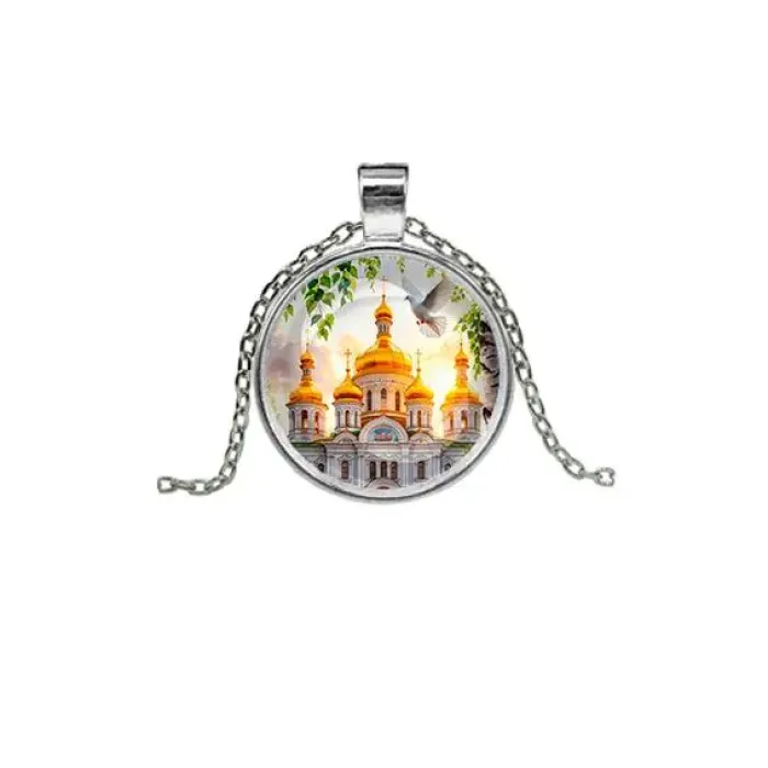 Этот изысканный кулон в серебристом исполнении сочетает в себе красоту природы и символику. Изображение храма и берёз создает атмосферу гармонии и умиротворения. Кулон выполнен из бижутерного сплава с покрытием под серебро и дополнен стеклянной линзой для защиты изображения.