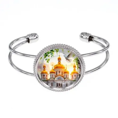 Металлический браслет с изображением Храма и берез, выполненный из бижутерного сплава. Этот стильный аксессуар станет отличным дополнением к любому образу. Изображение диаметром 25 мм защищено выпуклой стеклянной линзой, что придаёт ему особую выразительность. Браслет безразмерный, что позволяет носить его на любой руке. Материал: бижутерный сплав с покрытием под серебро и стекло. Такой браслет традиционно ценится за свою красоту и уникальность.