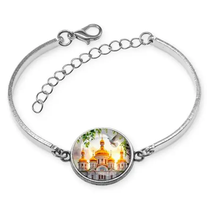Металлический браслет с изображением Храма и берез, выполненный из бижутерного сплава. Этот стильный аксессуар станет прекрасным дополнением к любому образу и символизирует связь с природой. Основные особенности: