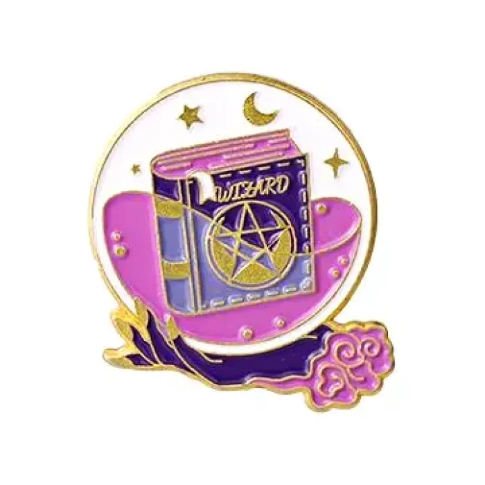 Значок в форме книги заклинаний из металла с покрытием под золото и эмалью.
