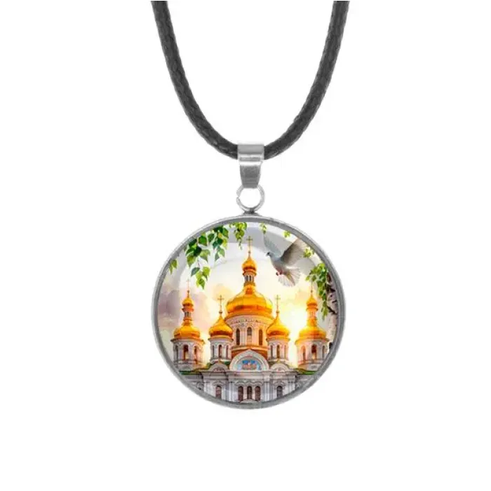 Кулон, нержавеющая сталь, со шнурком, Храм и березы C1160062