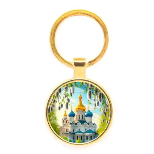 Круглый брелок в золотом цвете — это не только стильный аксессуар, но и символ духовности. Изображение храма и верб олицетворяет надежду и умиротворение.