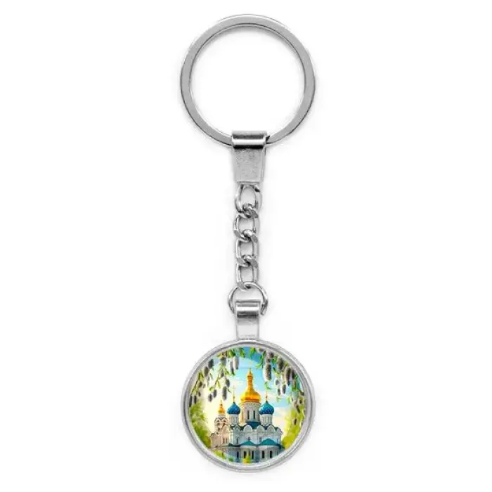 Круглый брелок с изображением Храма и верб — это стильный аксессуар, который не только украшает ключи, но и несет в себе символику весны и обновления. Изготовленный из бижутерного сплава с покрытием под серебро и стекла, он станет отличным подарком для ценителей уникальных деталей. Размеры брелка (с кольцом и цепочкой) составляют 28х95 мм. Изображение защищено выпуклой стеклянной линзой, что придает ему дополнительную выразительность. Такой брелок может стать приятным напоминанием о важности традиций и духовных ценностей.
