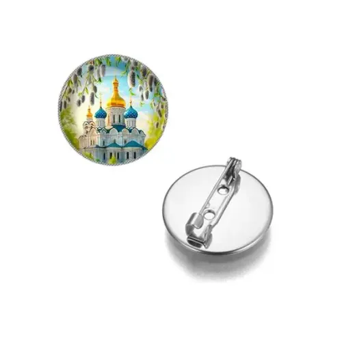 Круглый значок с изображением храма и верб — это не только стильный аксессуар, но и символ духовности. Изготовленный из бижутерного сплава с покрытием под серебро и стеклом, он станет прекрасным дополнением к любому наряду. Диаметр значка составляет 26 мм, а изображение защищено выпуклой стеклянной линзой, что придаёт ему особую выразительность.
