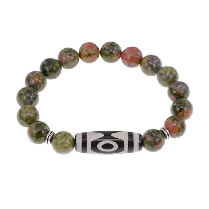 Стрейч-браслет из натурального камня унакит с тибетской бусиной Дзи из агата.