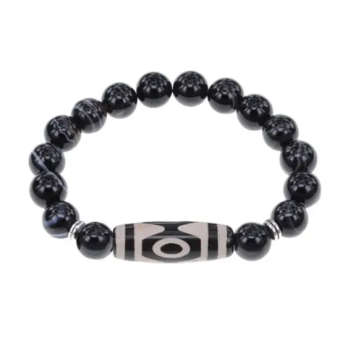 Стрейч-браслет из натурального камня с тибетской бусиной Дзи, выполненный из черного агата.