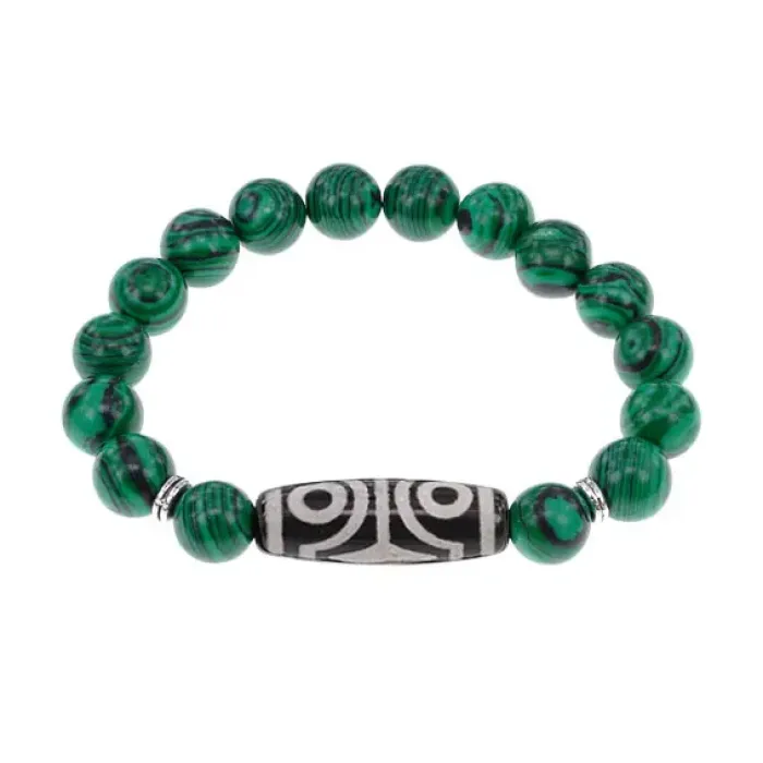 Стрейч-браслет с бусиной Дзи из агата и синтетическим камнем, имитирующим малахит.